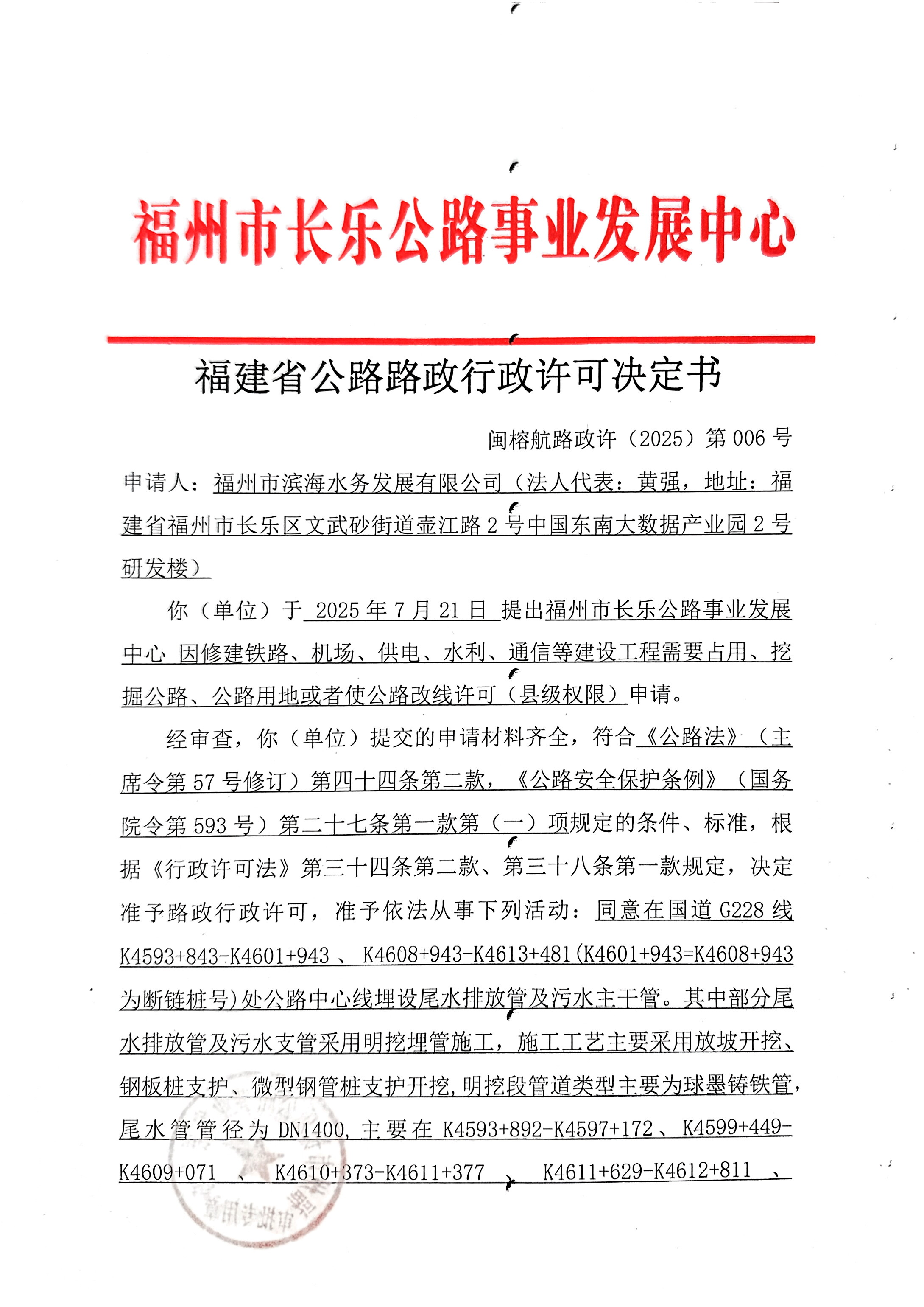 福州市长乐公路事业发展中心关于福州市滨海水务发展有限公司2025年7月24日行政许可决定公示(闽榕航路政许(2025)第006号)