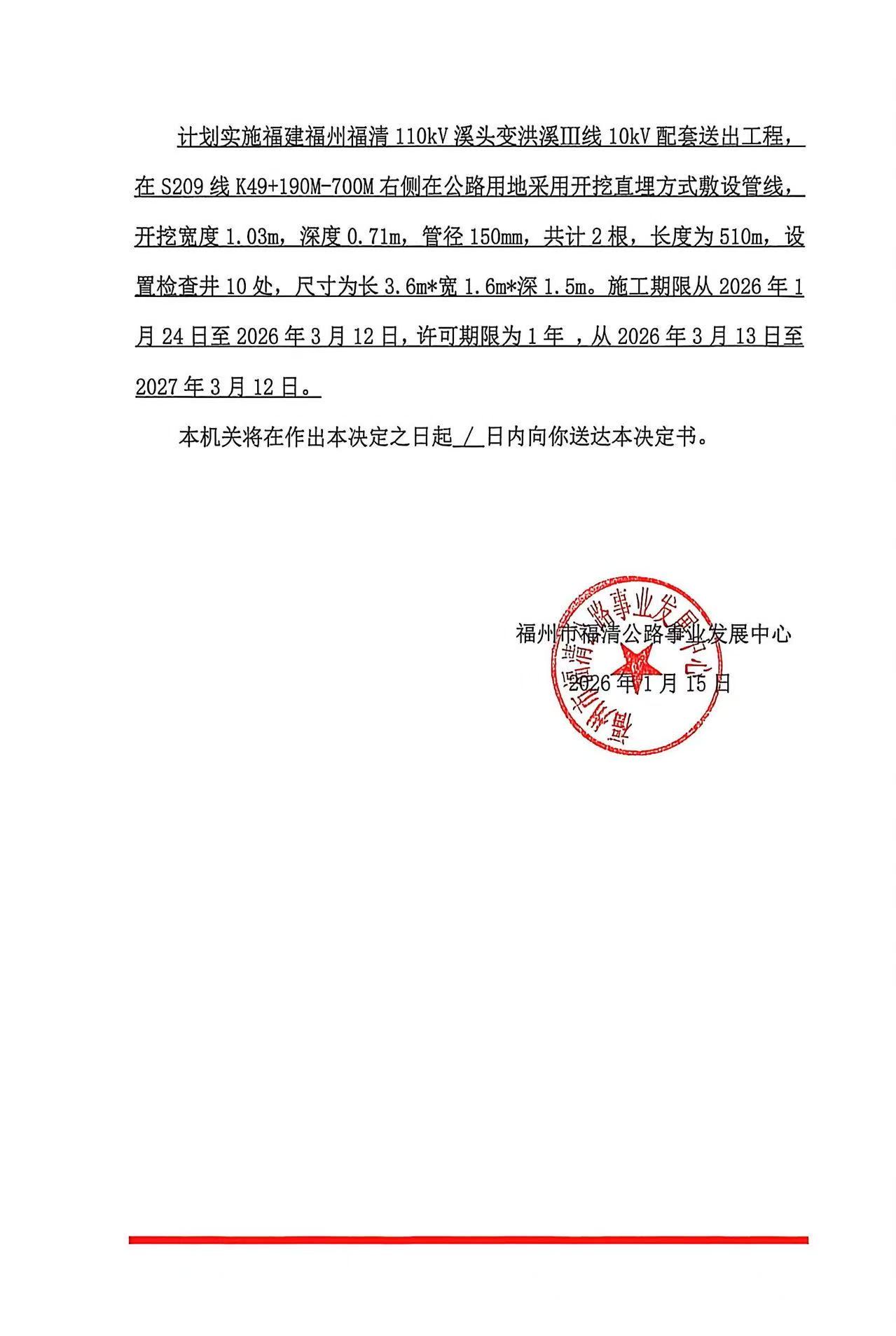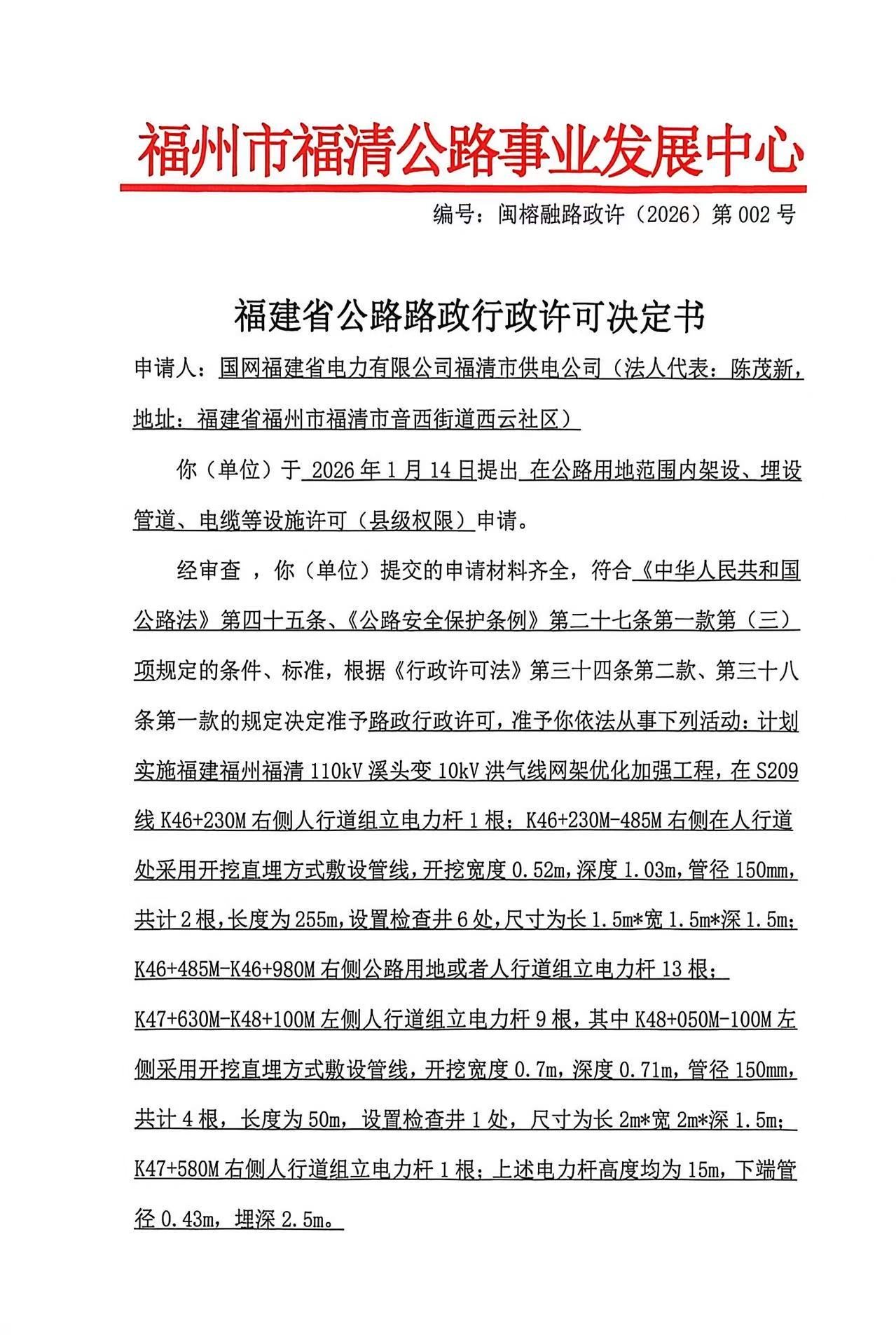 福州市福清公路事业发展中心2026年1月15日关于国网福建省电力有限公司福清供电公司在公路用地范围内架设、埋设管道、电缆等设施许可(县级权限)的福建省公路路政许可决定书公示(闽榕融路政(2026)第002号)
